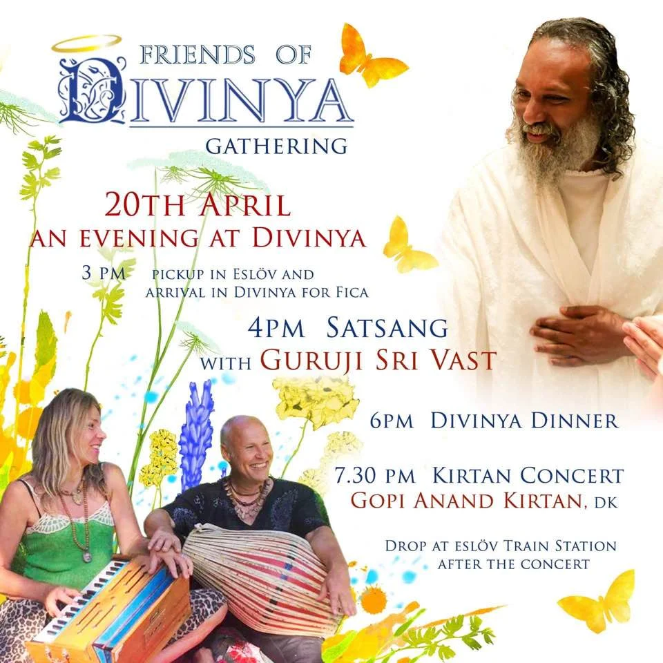 Welcome to the ‘Friends of Divinya’ spring gathering on Saturday April 20th. We invite for an afternoon Satsang with Guruji Sri Vast, followed by dinner and a kirtan concert with Gopi Anand from Copenhagen.